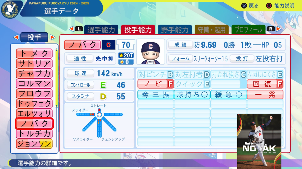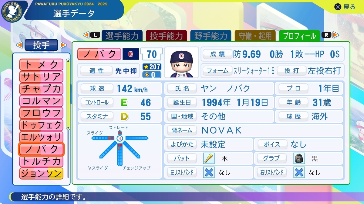 ゴロピッチャー・一発・・・3年前はチェコのデータサイトでGB%も見れたけどそんなに高く無かった記憶 落差の大きい変化球が武器なため、「合わせようと下からの意識でスイング→ナチュラルに落ちてきたストレートを普通にミートされる」という現象がよくある