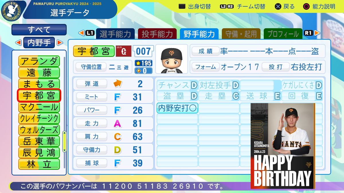 7/16 2025版作成 二塁コンバート、外野適正追加、弾道1→2、ミートF23→F31(+8)、パワーF22→F26(+4)、走力B79→A81(+2)、肩力D52→C63(+11)、守備力F38→D51(+13)、捕球F31→F39(+8)、送球D→E、内野安打○追加